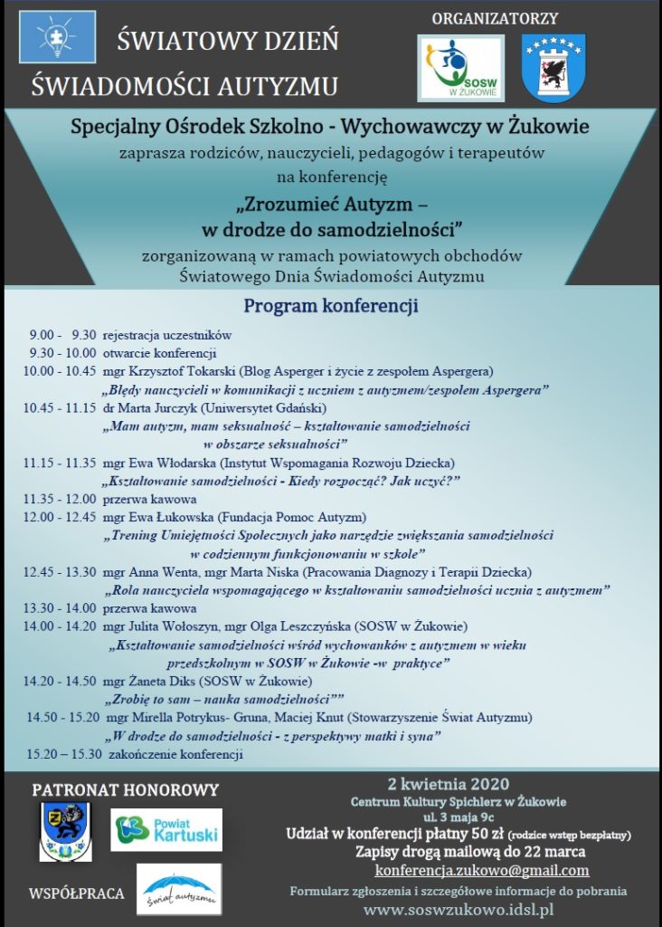 Już po raz piąty Specjalny Ośrodek Szkolno -Wychowawczy w Żukowie zaprasza na konferencję skupioną wokół tematyki wspierania osób z zaburzeniami ze spektrum autyzmu ” Zrozumieć Autyzm – w drodze do samodzielności” w ramach powiatowych obchodów Dnia Świadomości Autyzmu. W tym roku poruszane będą zagadnienia kształtowania samodzielności. Nie zabraknie wystąpień wspaniałych specjalistów – terapeutów, nauczycieli, trenerów […]