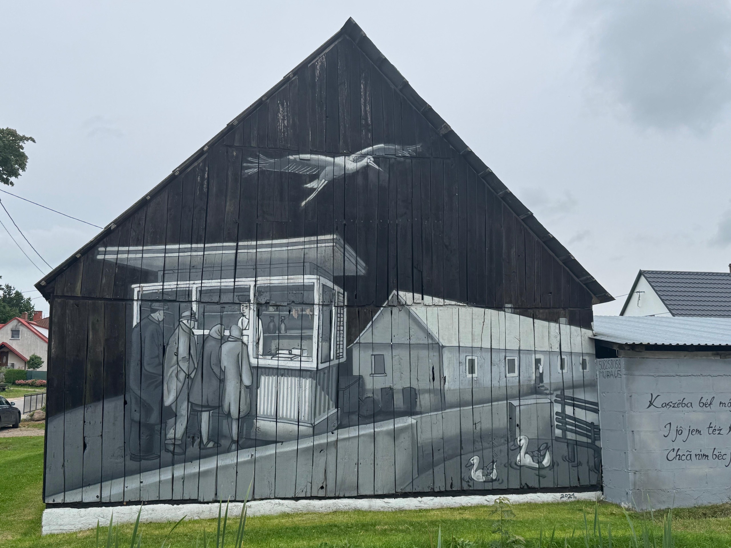 To kolejne już malowidło w tej miejscowości w gminie Stężyca. Cztery lata temu na jednej ze stodół przedstawiono kadr z Polskiej Kroniki Filmowej o kiosku Ruchu działającym w latach 60-tych ubiegłego wieku. – Postanowiliśmy iść za ciosem – mówią: sołtys Jacek Treder i szefowa stowarzyszenia ”Kaszubianki” Maria Birr.