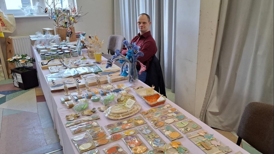 Mateusz (Warsztat Terapii Zajęciowej w Somoninie): No, tu mamy świece sojowe, mamy wieszaczki, mydełka, torby i jajka. A kto to wszystko przygotował? No ja, kolega Paweł i pani Agnieszka. Żeby kupowali dużo!