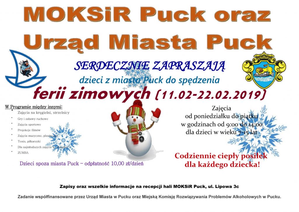 Skierowane są do dzieci w wieku od 7 do 15 lat. Animatorzy zabiorą je na kręgielnie i strzelnicę, będą projekcje filmów, zumba i rozgrywki sportowe. Każdego dnia program rozpocznie się o 09:00 i potrwa do 14:00. Ferie organizowane są głównie z myślą o dzieciach z miasta, dla których są bezpłatne. Młodzi mieszkańcy okolic Pucka mogą w nich uczestniczyć za 10 zł dziennie. Zapisać się można w recepcji hali puckiego MOKSiRu.